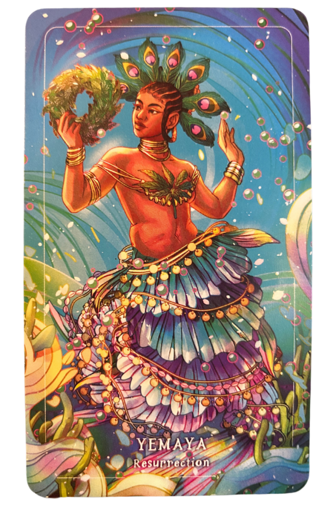 And then I see Yemaya, flowing and dancing across the card, reminding me that resurrection isn’t always loud or grand.